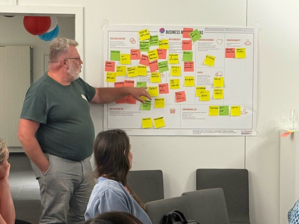 Am Workshop feilen er und die anderen Teilnehmenden in Gruppen unterteilt an fünf Geschäftsideen. Dabei wenden sie das Business Model Canvas (BMC) an, definieren ihr Wertangebot, die Zielsegmente, Vertriebskanäle u.a.m.